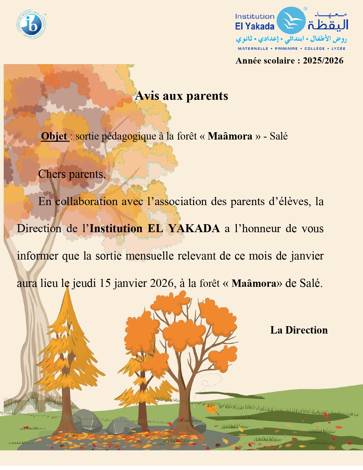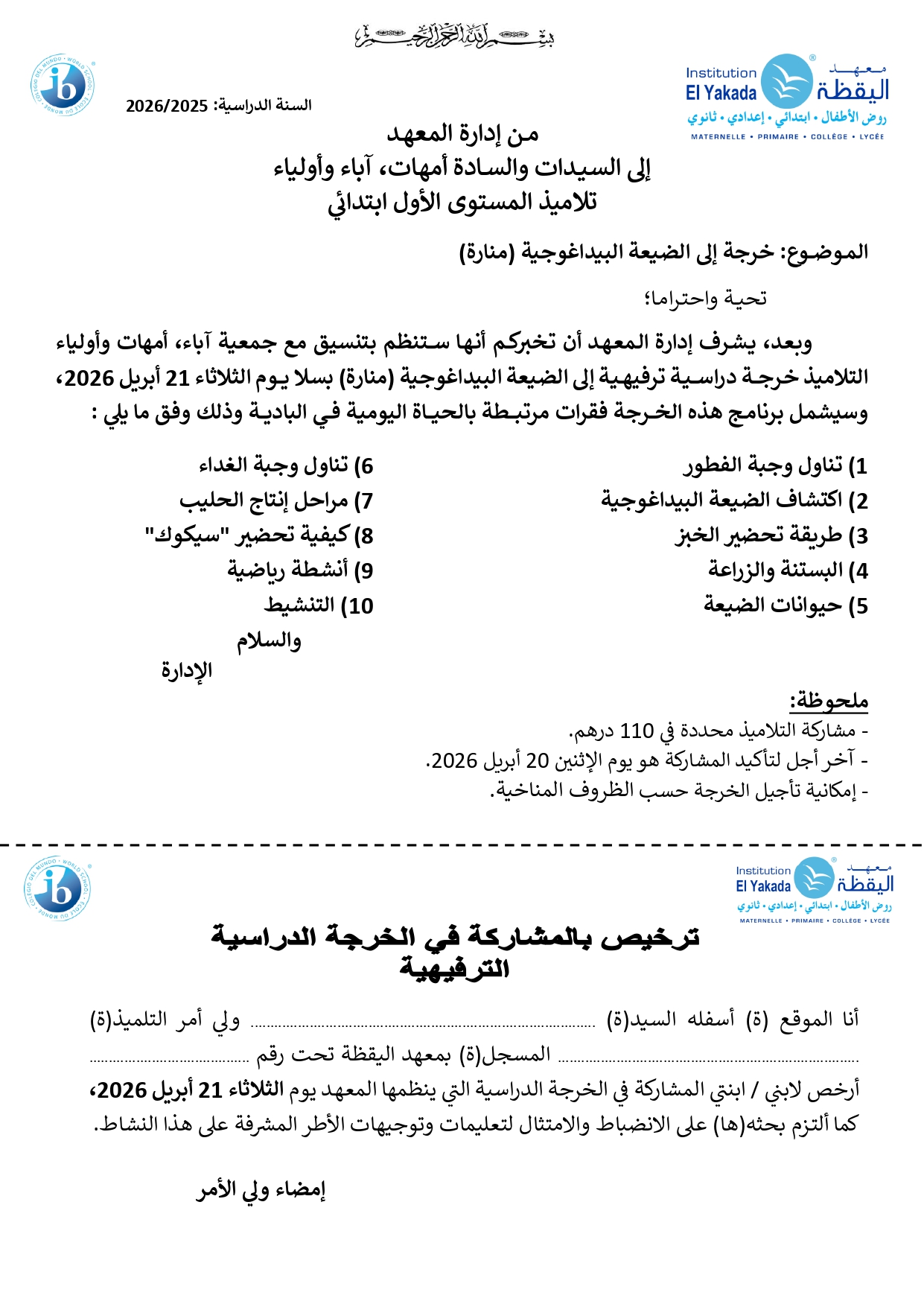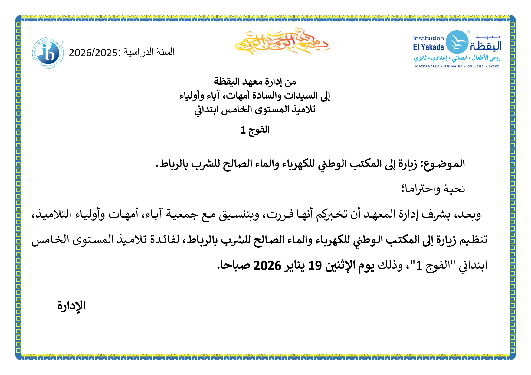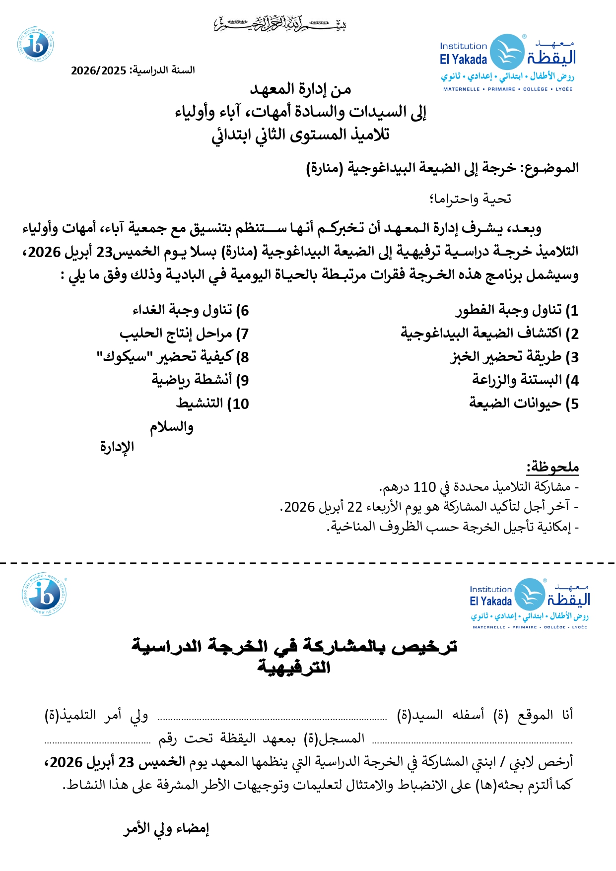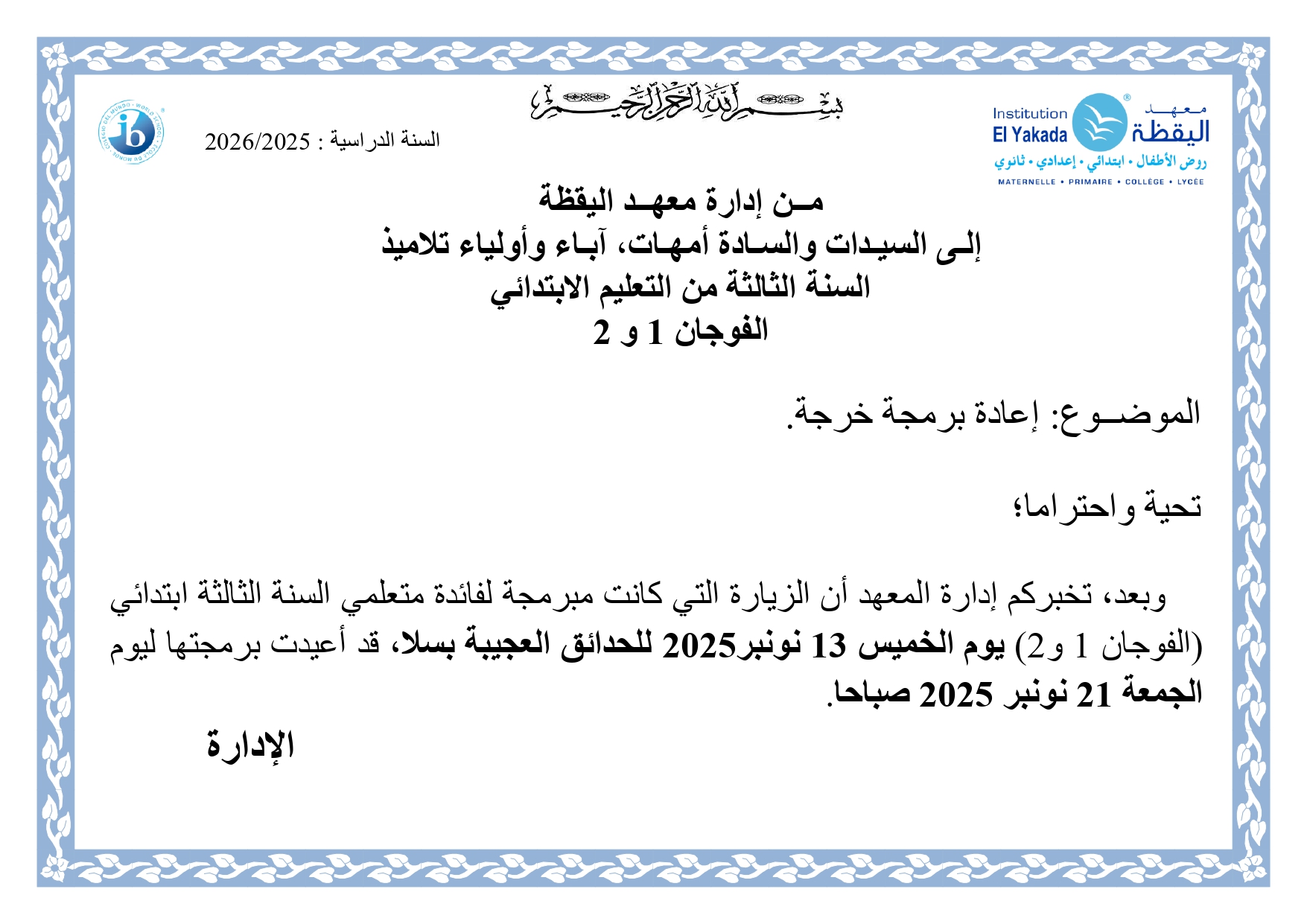 تأجيل خرجة إلى الحدائق العجيبة بسلا – تلاميذ المستوى الثالث من التعليـم الابتدائـي الفوجان 1 و2 – اليقظة 1 |