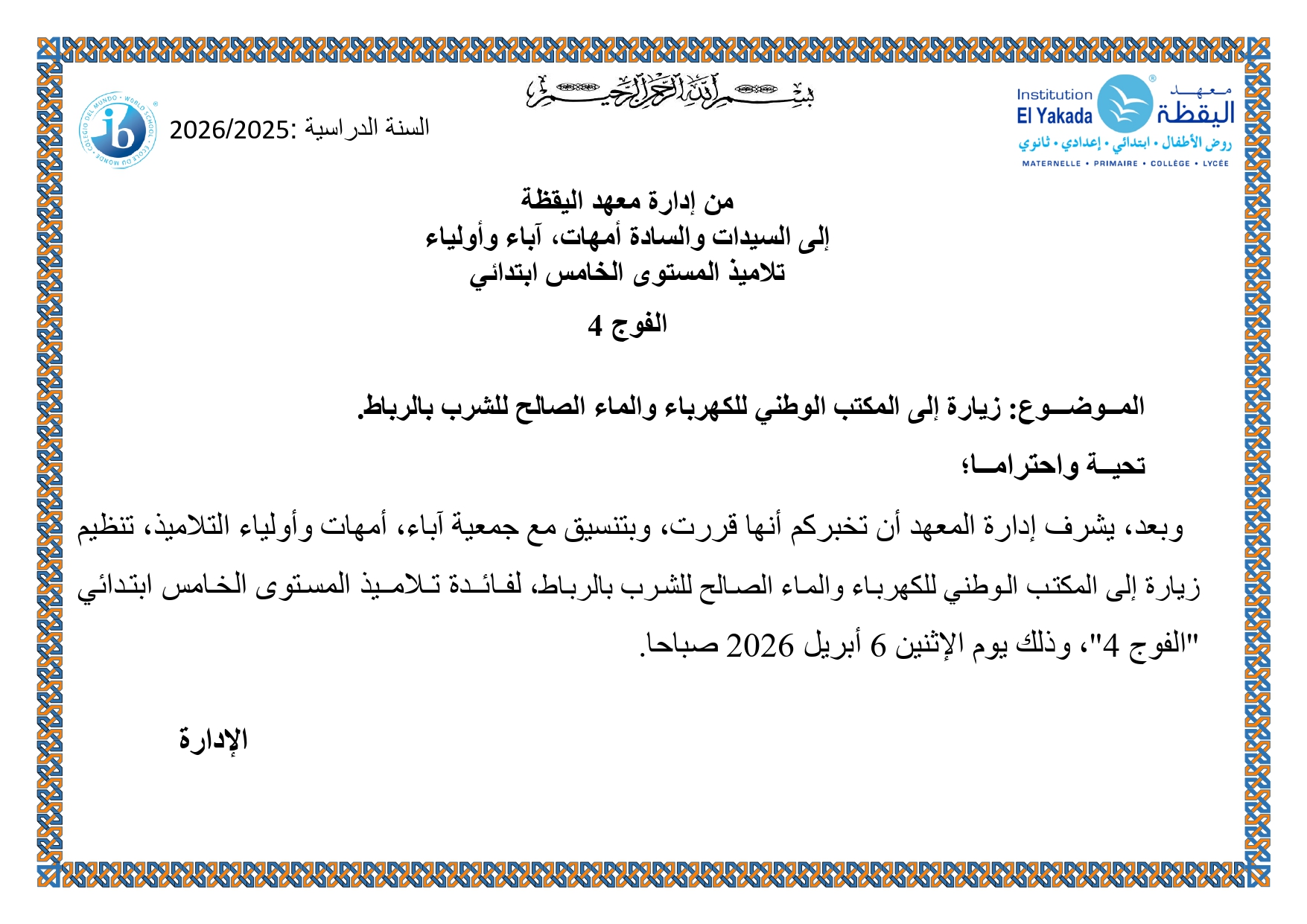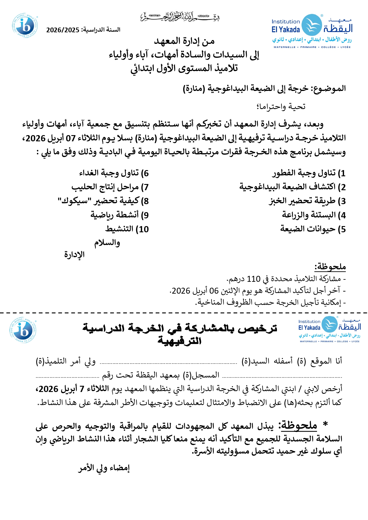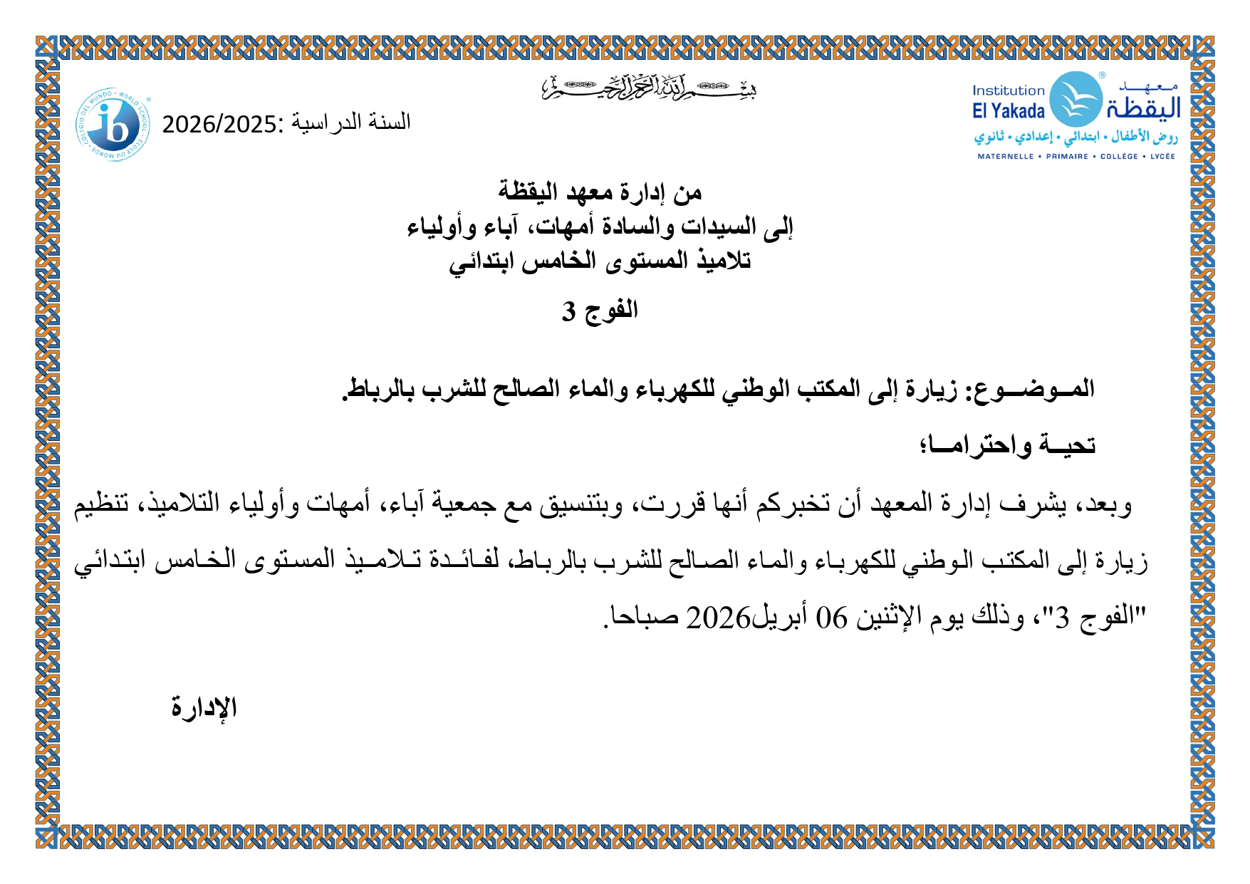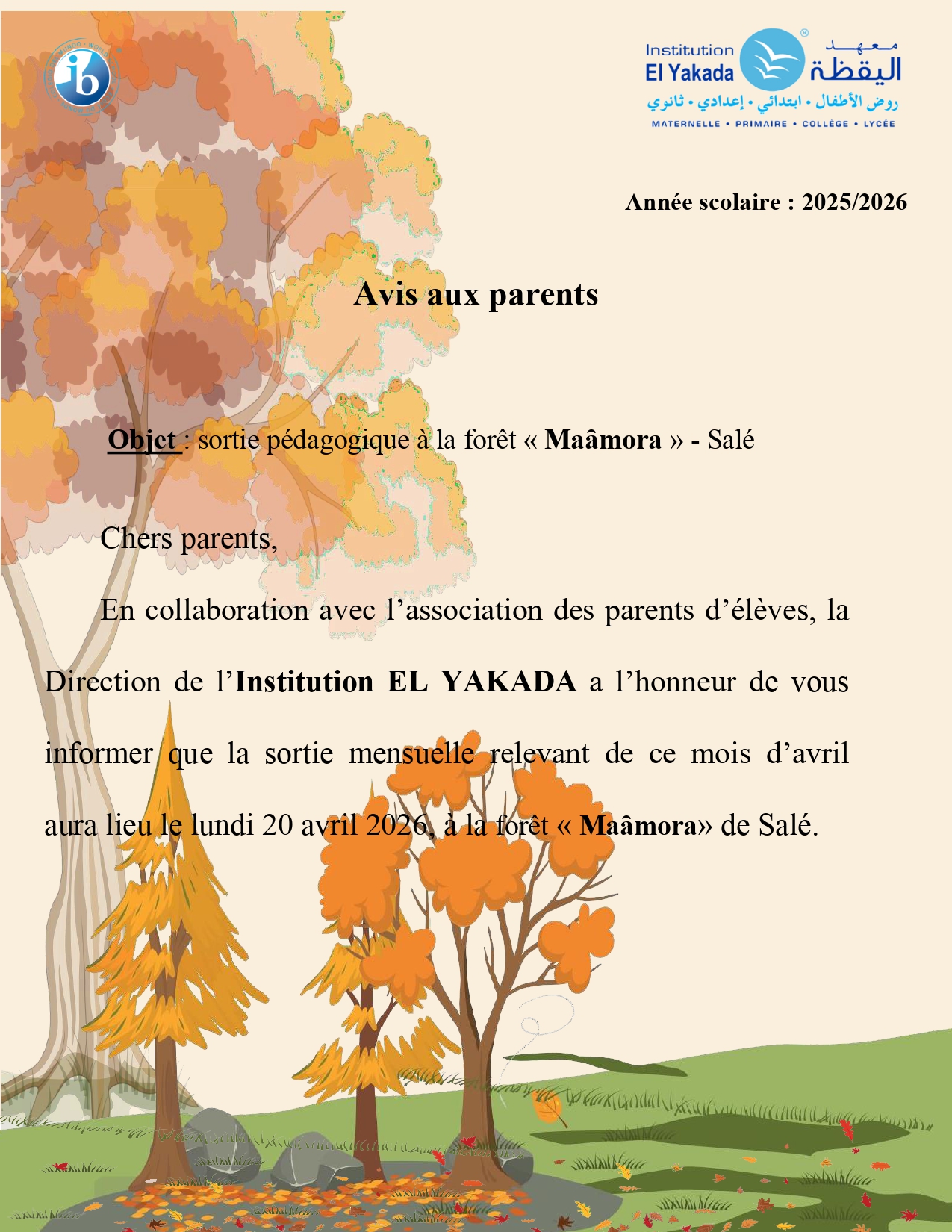 تأجيل خرجة إلى الحدائق العجيبة بسلا – تلاميذ المستوى الثالث من التعليـم الابتدائـي الفوجان 1 و2 – اليقظة 1 |