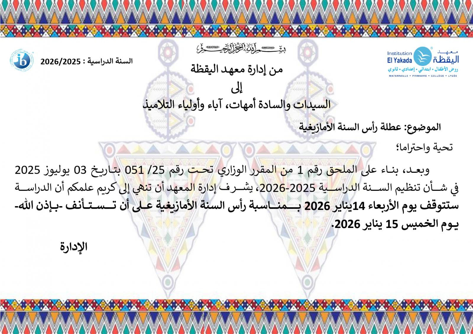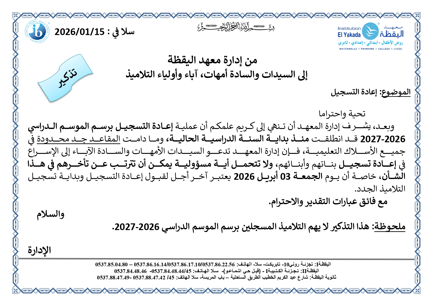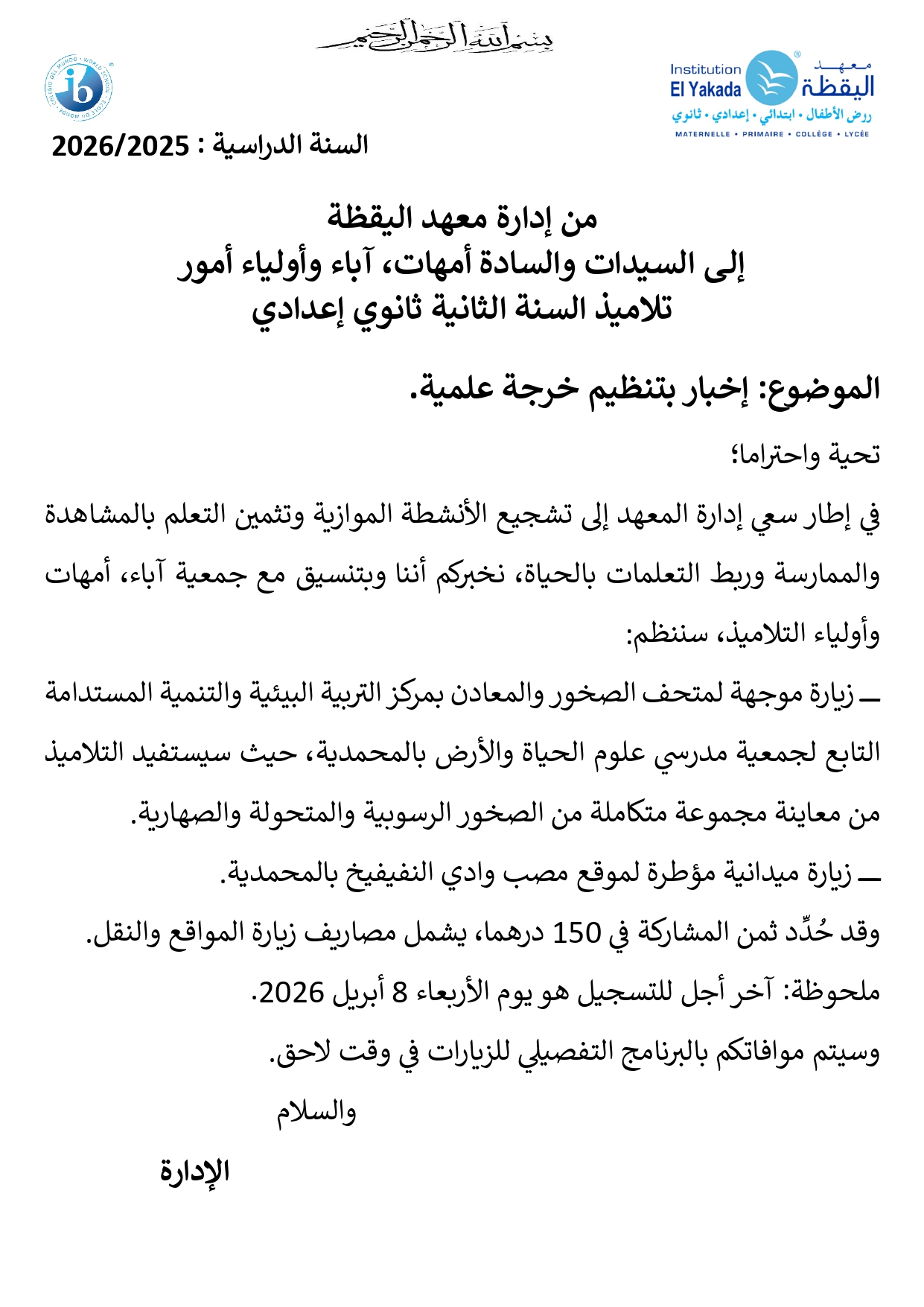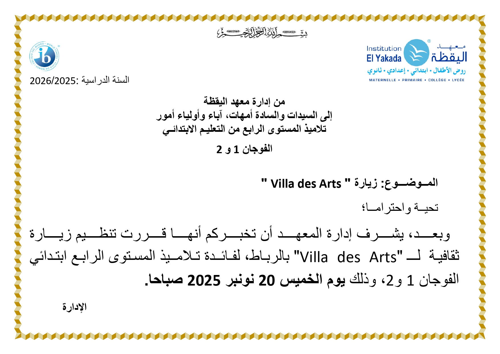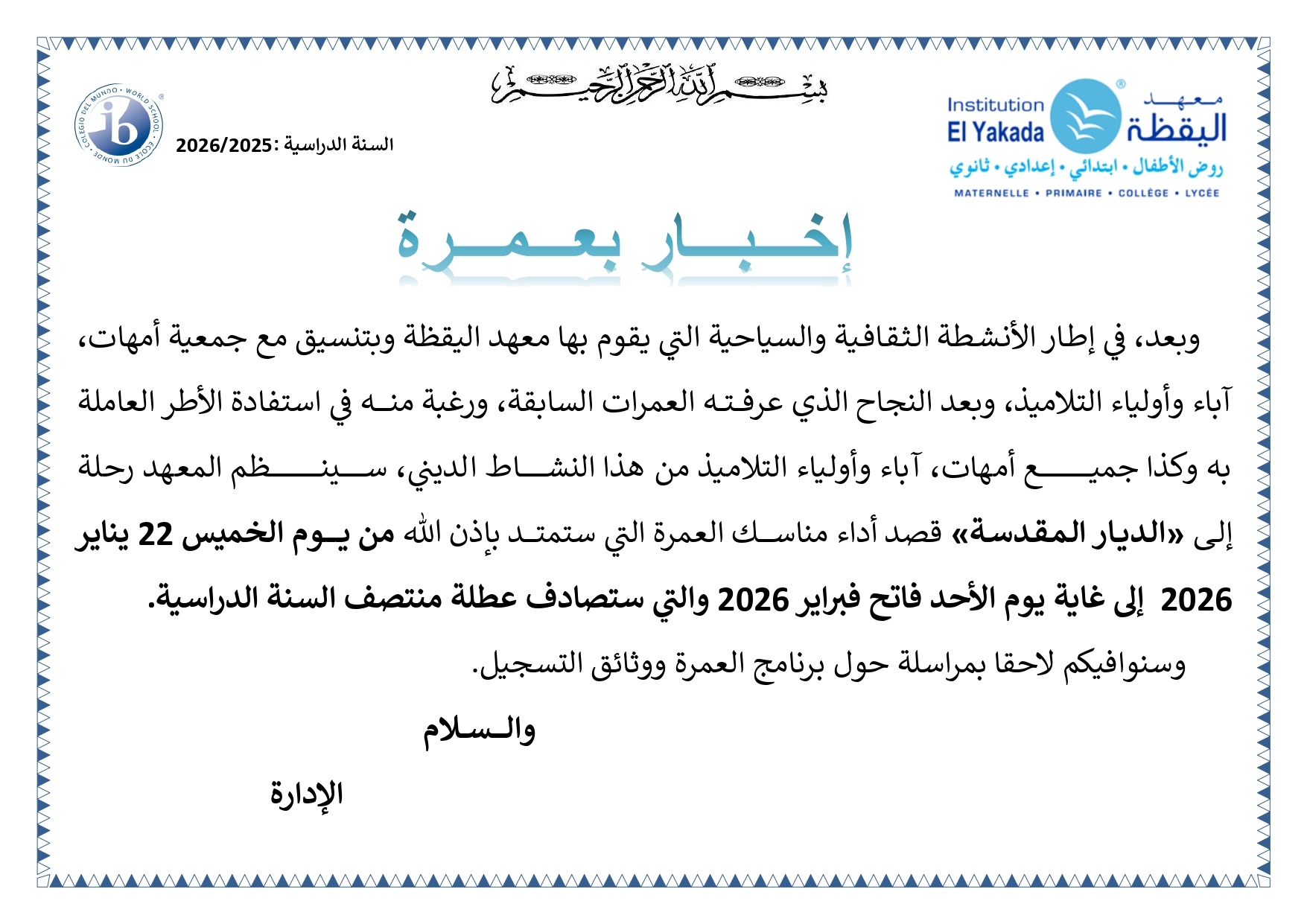 تأجيل خرجة إلى الحدائق العجيبة بسلا – تلاميذ المستوى الثالث من التعليـم الابتدائـي الفوجان 1 و2 – اليقظة 1 |