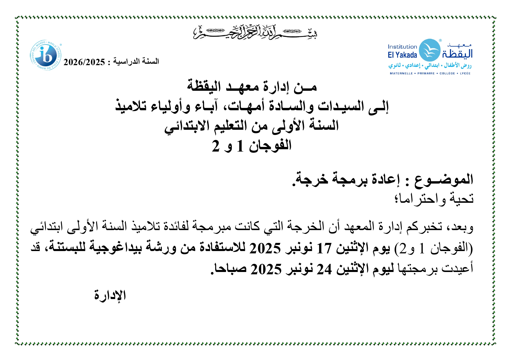 إعادة برمجة خرجة – تلاميذ المستوى الأول من التعليـم الابتدائـي الفوجان 1 و2 – اليقظة 2 |