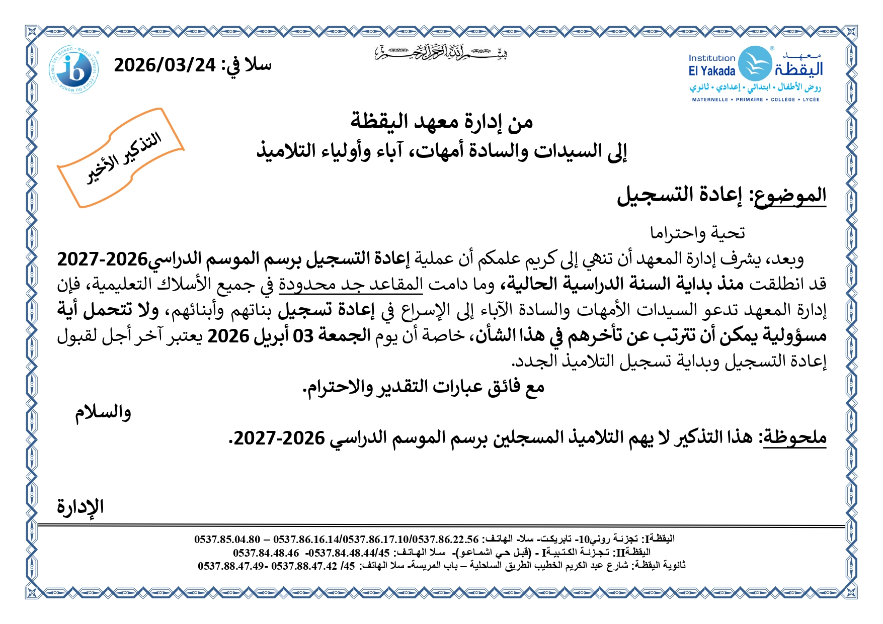 إعادة التسجيـل – التذكير الأخير