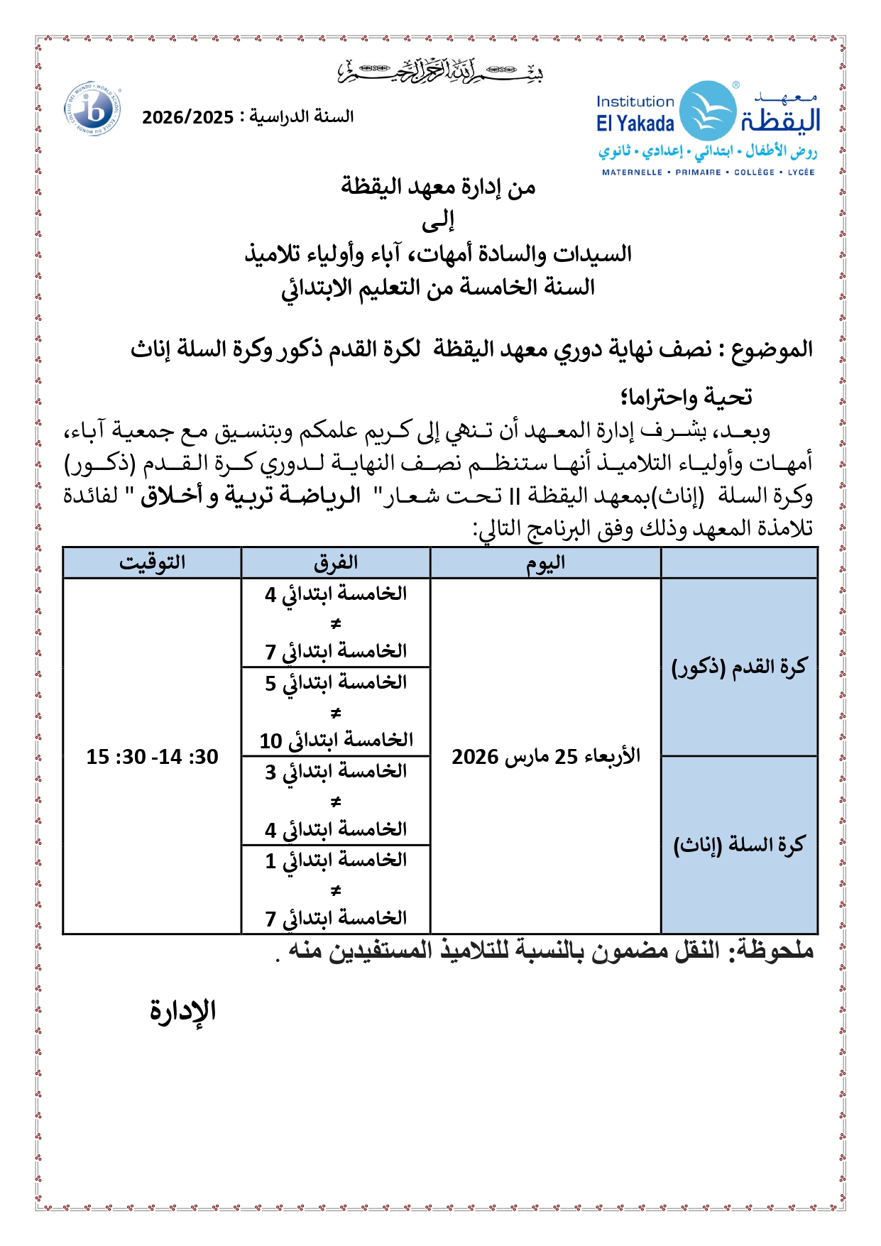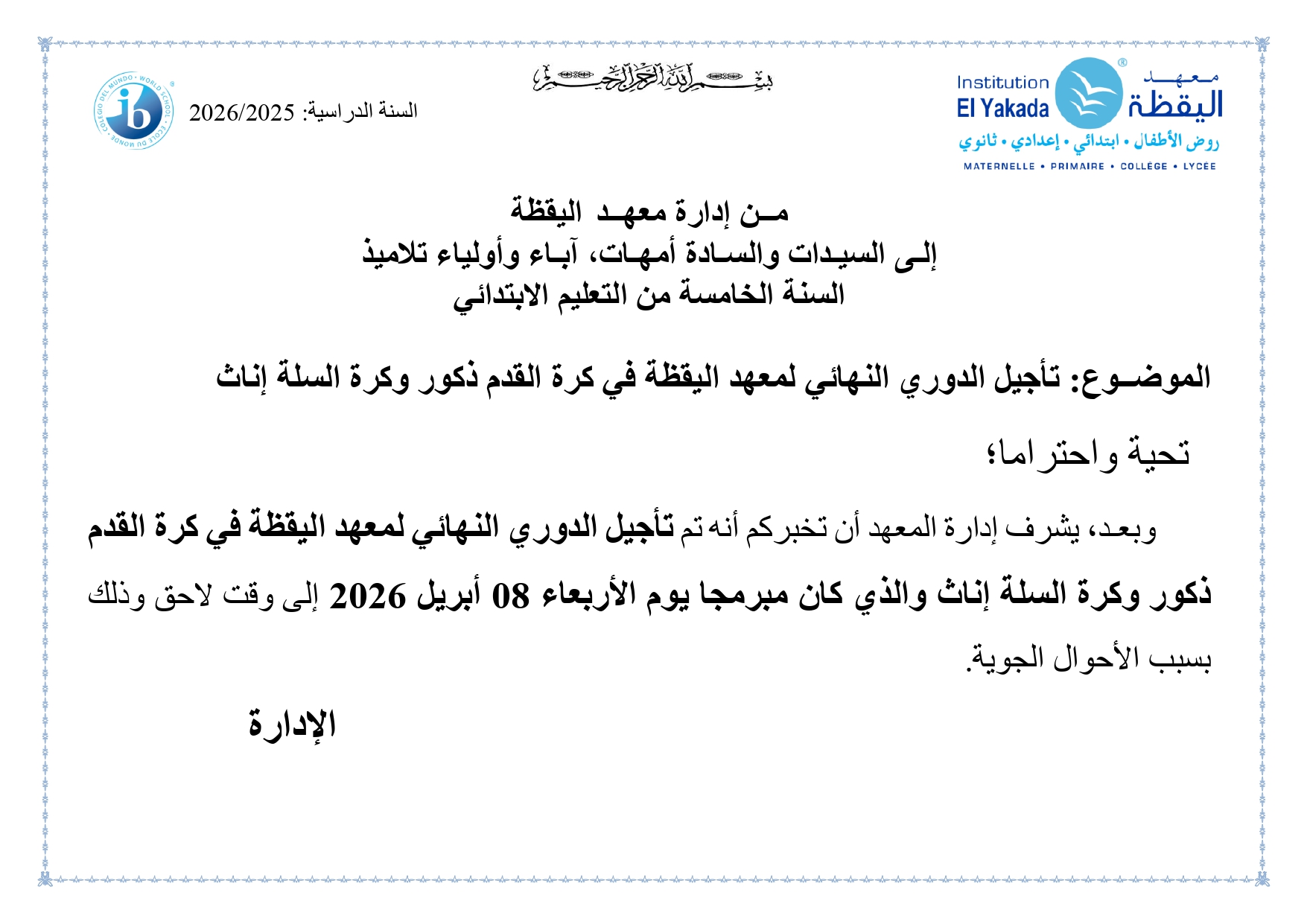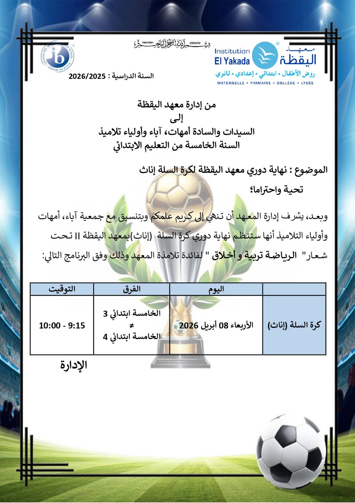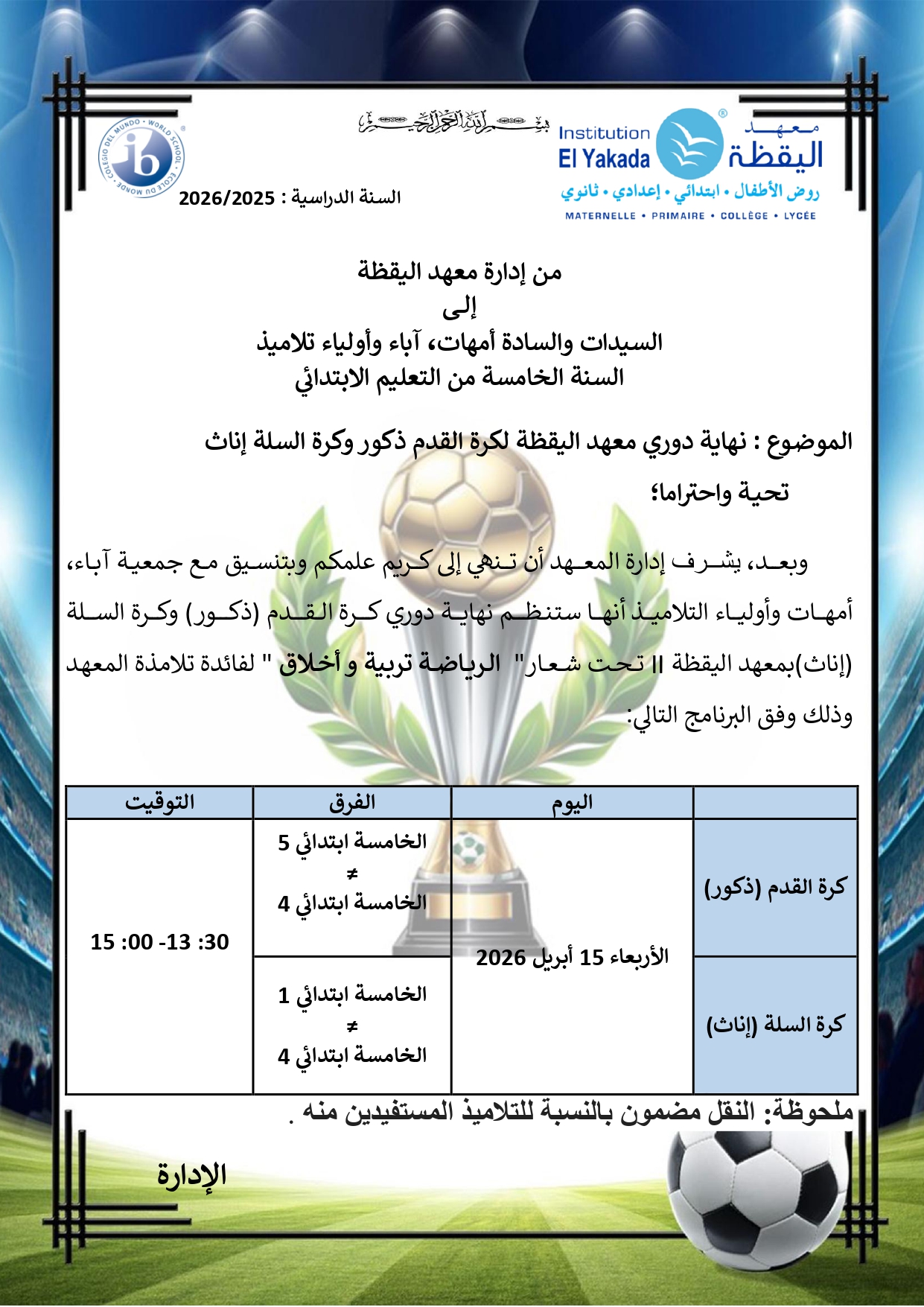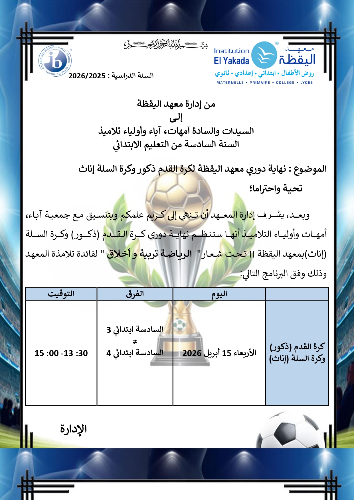 تأجيل الدوري النهائي لمعهد اليقظة في كرة القدم ذكور وكرة السلة إناث – الخامس ابتدائي – اليقظة 1 |