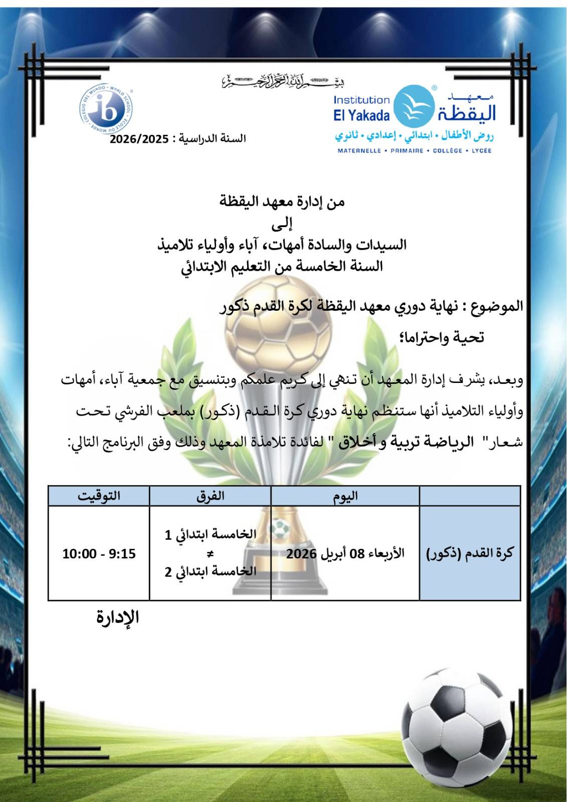 دوري معهد اليقظة لكرة القدم و السلة – تلاميذ المستوى الخامس ابتدائي – اليقظة 2 |