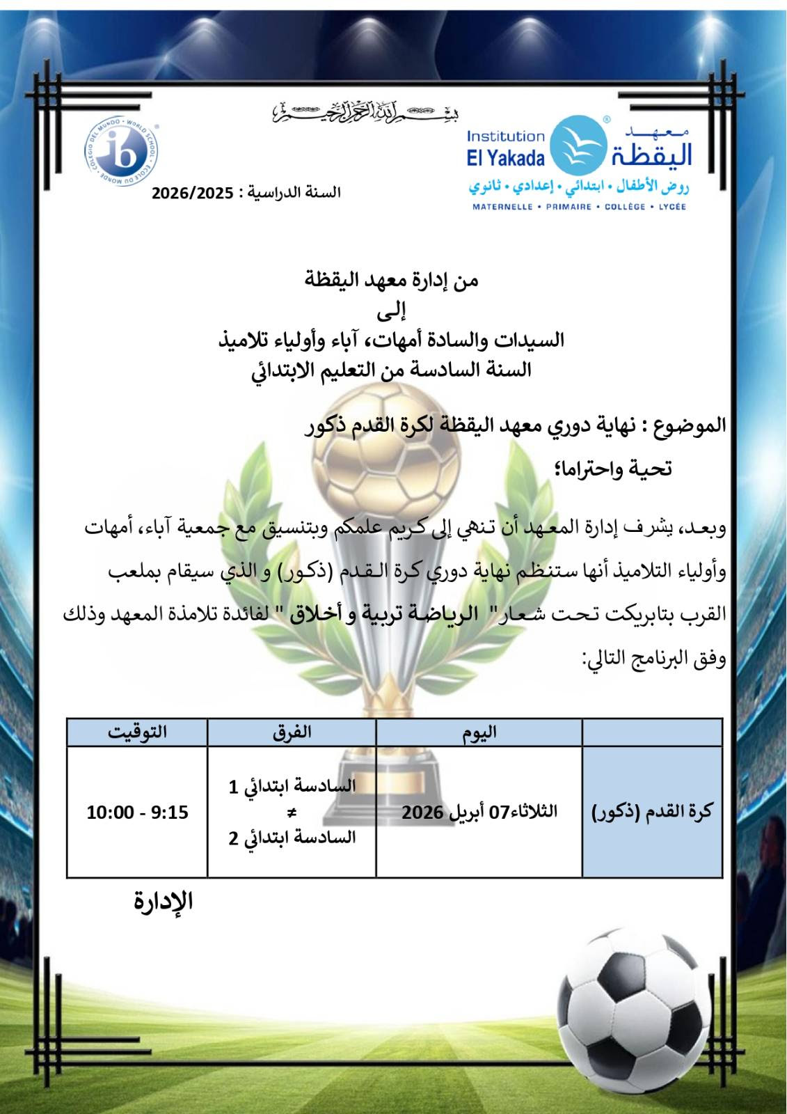 دوري معهد اليقظة لكرة القدم و السلة – تلاميذ المستوى السادس ابتدائي – اليقظة 2 |