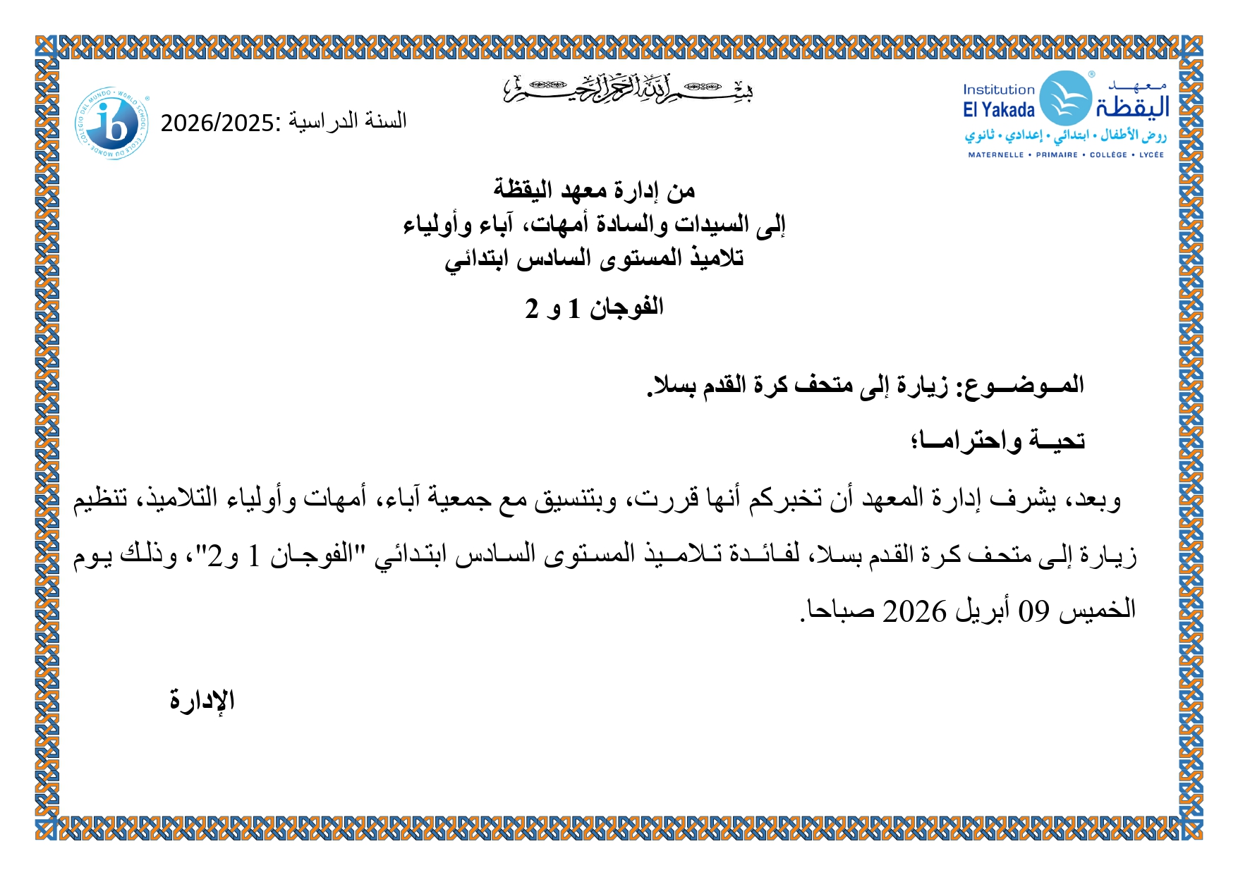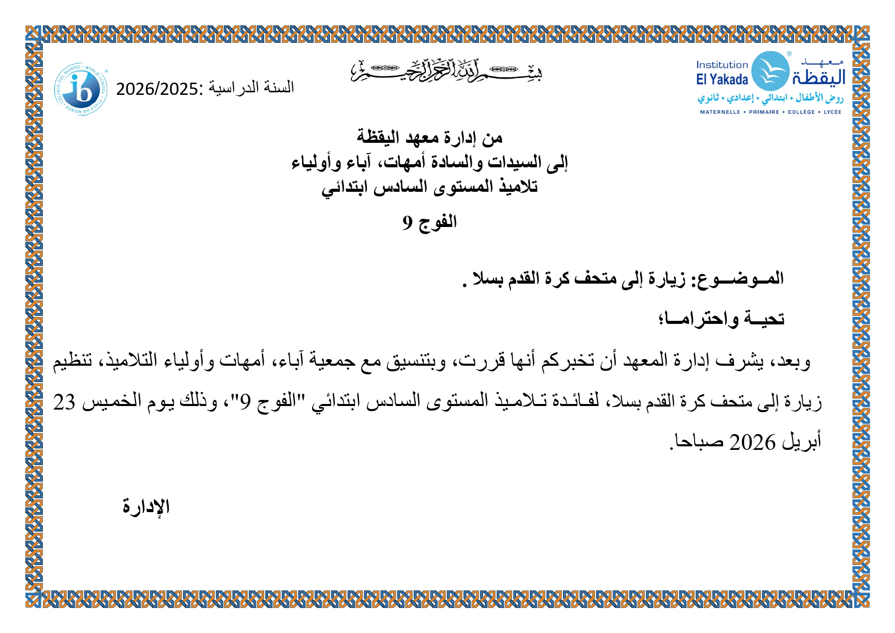 إعادة برمجة زيارة متحف السرية النبوية – تلاميذ السنة السادسة من التعليم الابتدائي – الفوجان 1 و 2 – اليقظة 1 |