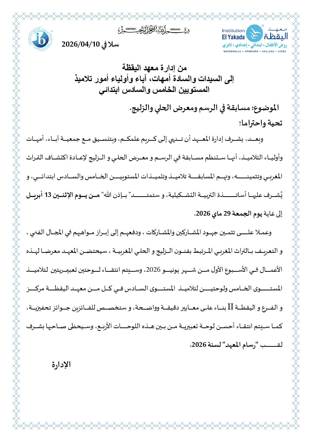 مسابقة في الرسم ومعرض الحلي والزليج – تلاميذ المستوى الخامس والسادس ابتدائي |